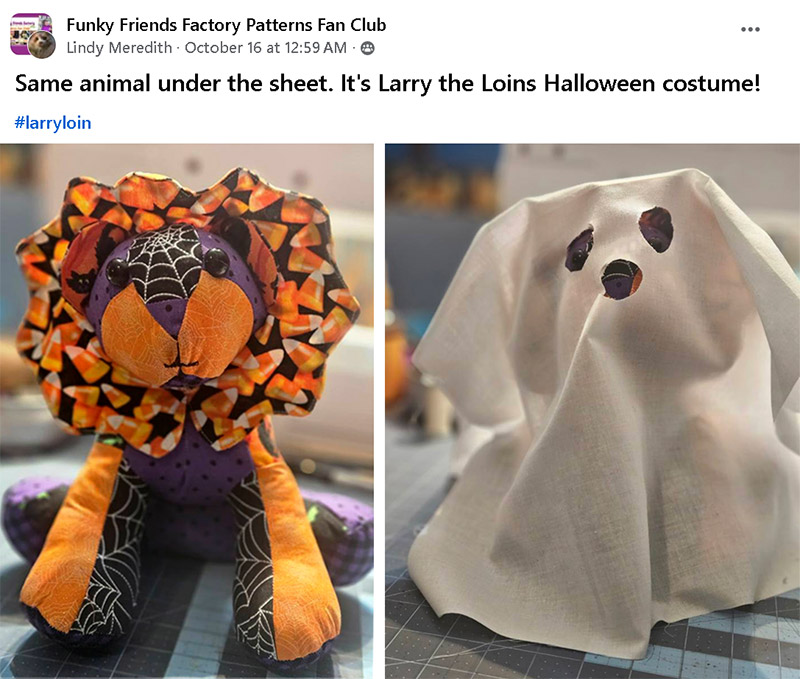 I hope you’ll get as big a laugh from this entry as I did! Lindy Meredith sewed up Larry Lion in Halloween candy fabric…and then made his a “costume.” 😆