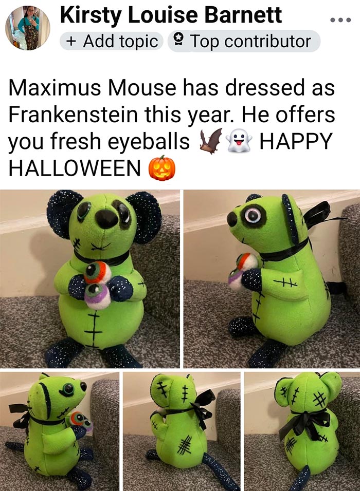 Here’s a really unique Maximus Mouse! Kirstie Louise Barnett sewed up Maximus Mouse to look like a Frankenstein’s monster using green fabric and a few decorative black stitches.