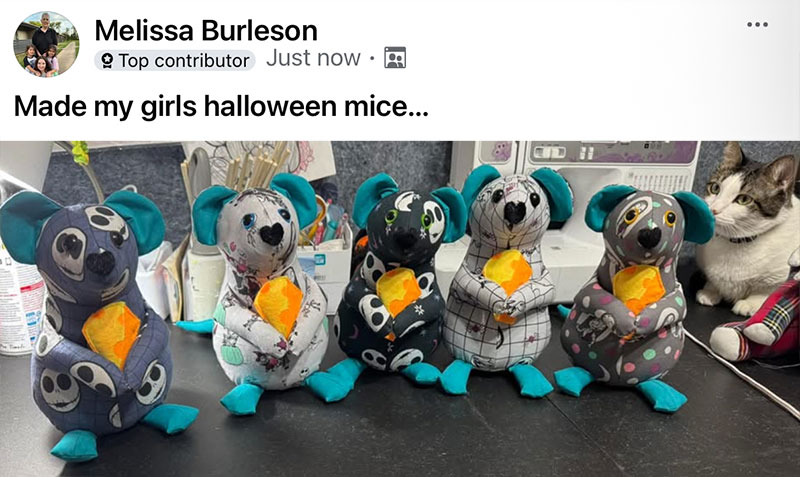 Here’s a whole troop of Halloween mice ready to be used as treats for special kids. Each Maximus Mouse is different! Do you see Melissa Burleson’s cat ready to pounce?