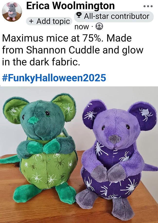 Almira S used a selection of vintage Halloween theme fabrics for her trio of Halloween Maximus Mice. Do you see the Oct 31 date specially placed on one mouse’s paw?
