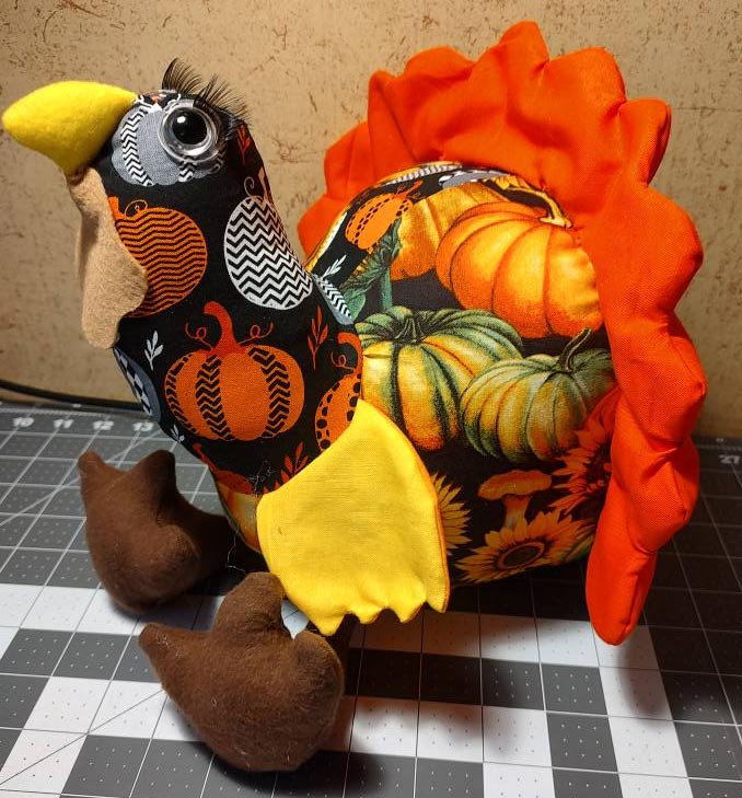 I love that Tom Turkey is getting in on the Thanksgiving action early this year with his Halloween-appropriate pumpkin fabric. This turkey was sewn by Geri Glass.