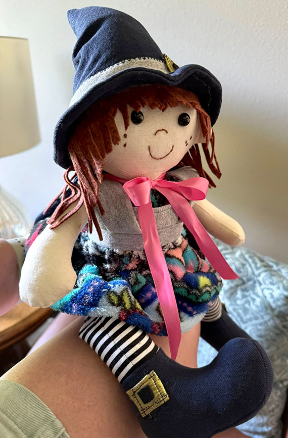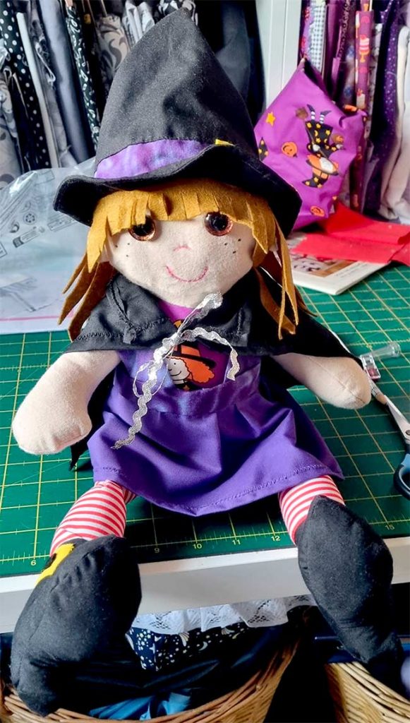 Susan Johnstone gave her Whitney Witch some added flair by tying her cape closed with silver ric-rac. I also like the witch fabric on the toy’s chest.