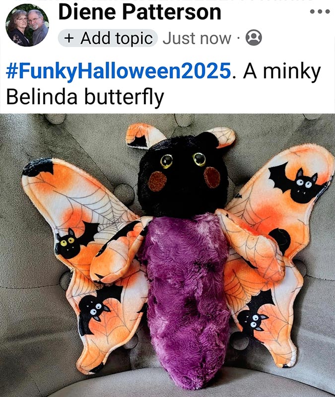 Here’s another really creative entry! Diene Patterson sewed up Belinda Butterfly in some beautiful bat fabric and purple minky.