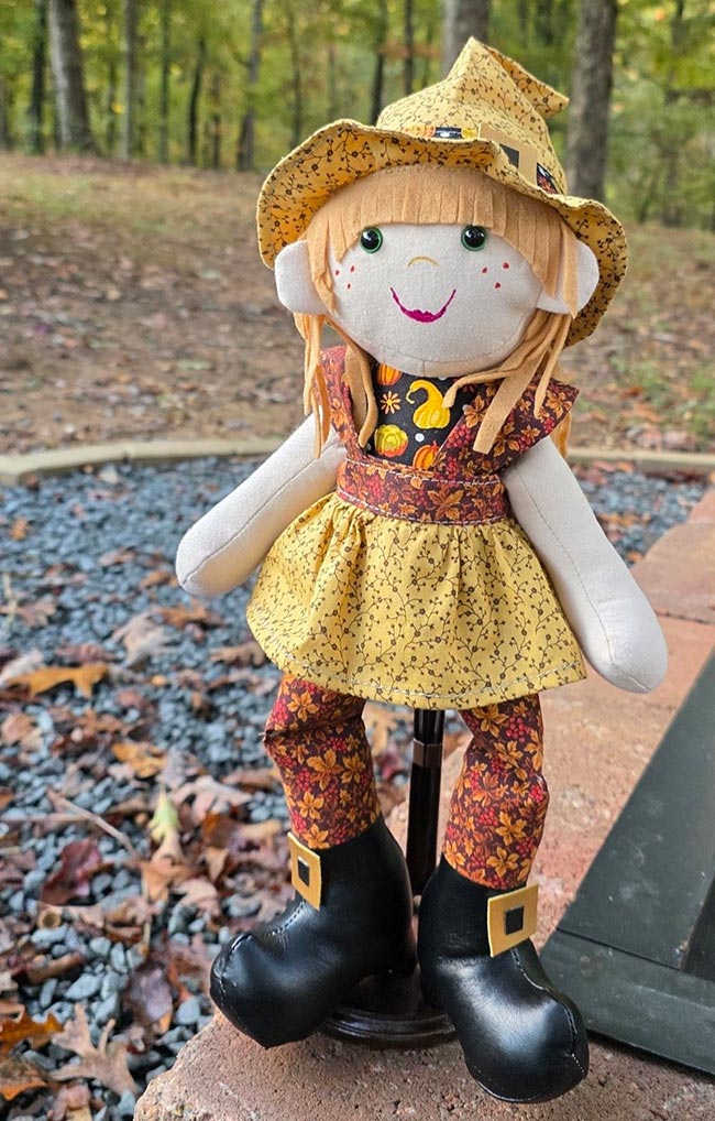 This sweet Whitney Witch looks happy it’s nearly Halloween! Christy Rupe used all upcycled materials to sew this pattern.