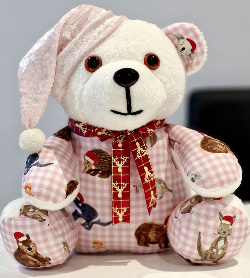 This Ben BEGINNER teddy bear was sewn by Sandra Fordham as a Christmas gift. She used the Funky Friends Factory free Christmas hat pattern to add a festive touch. (See the link below her photo!)