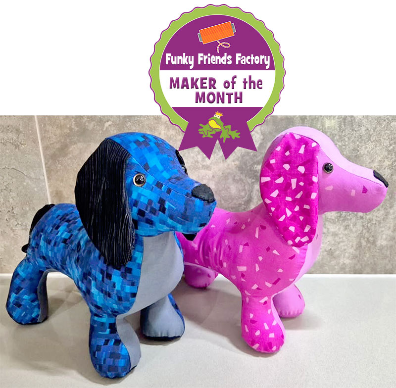 Congrats to this month’s winner Jenny Templeton. who used the Digger Dachshund sewing pattern to create a pair of puppys for a friend of hers whose grandkids were coming to visit. (What a LOVELY friend Jenny is!)Β