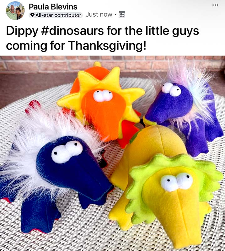 Got guests coming for Thanksgiving? Why not give all the little ones a cuddly Dippy Dinosaur toy to play with like Paula Blevins did?