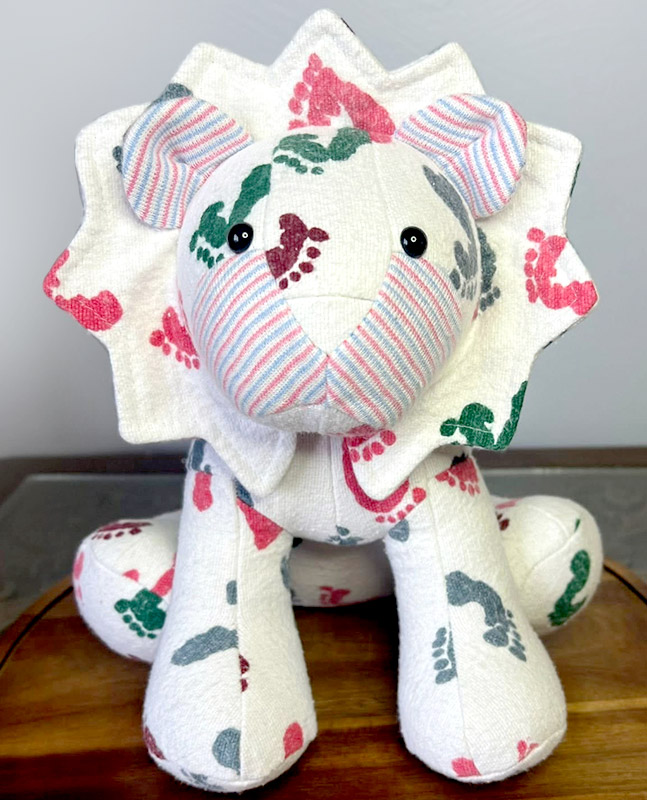 This lovely Larry Lion was sewn as a keepsake by Lindsey Mortimer who turned a baby receiving blanket into a memory toy.