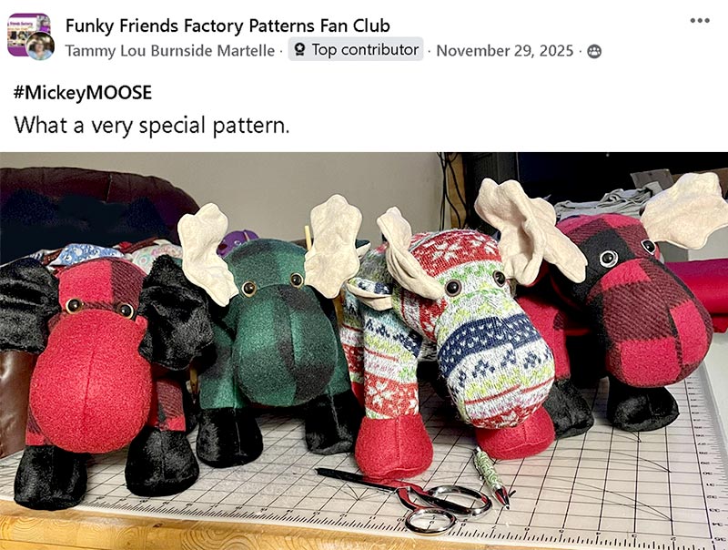 Tammy Lou Burnside Martelle sewed this FUN bunch of Mickey Moose toys for Christmas gifts.