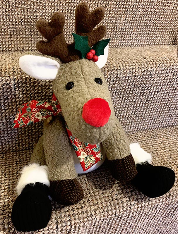 Reggie Reindeer is just as cute as Christmas decor OR a Christmas toy. This sweet Reggie Reindeer was sewn by Pat Ranger.Β