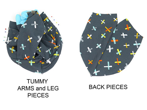 Place the BACK PIECES on top of the TUMMY PIECES with the ARMS and LEGS in between them and pin them together.