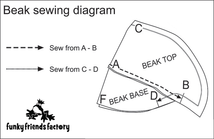 Pin the BEAK PIECES to the BODY PIECES matching point C and F. Sew from F – C – F on the other side.
