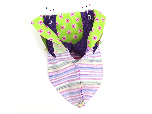 Pin the FACE & HEAD PIECES to the TUMMY & BACK PIECES and sew them together from B – X – D – C – D – X – B. (Along the neck seam!)