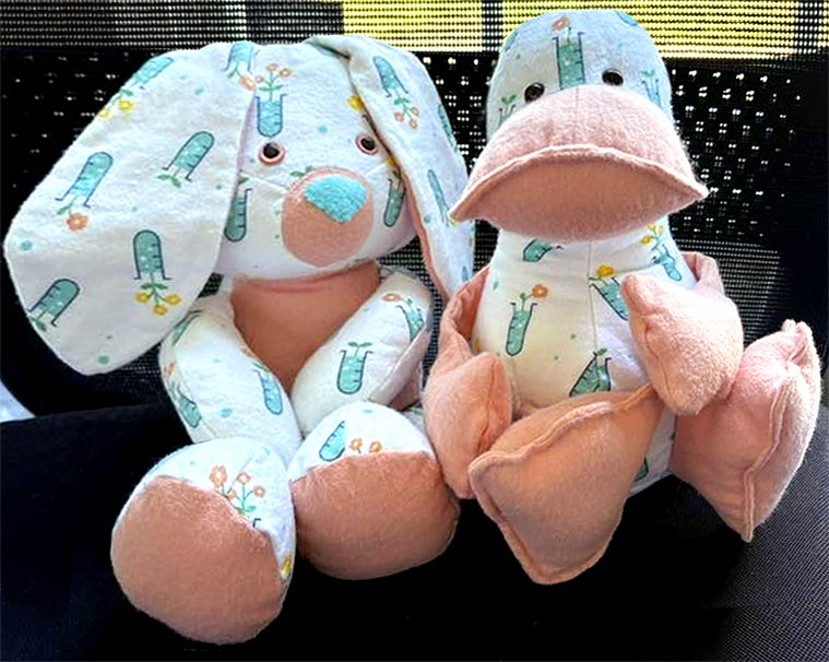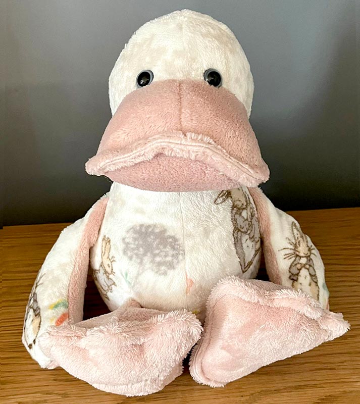 Emma Boulton of Emma’s Patchwork Memories sewed a keepsake Dilby Duck using baby clothes made from Petter Rabbit fabric! Look how she cleverly fussy cut the fabric so the bunnies are perfectly positioned on the wings and tummy.π€©