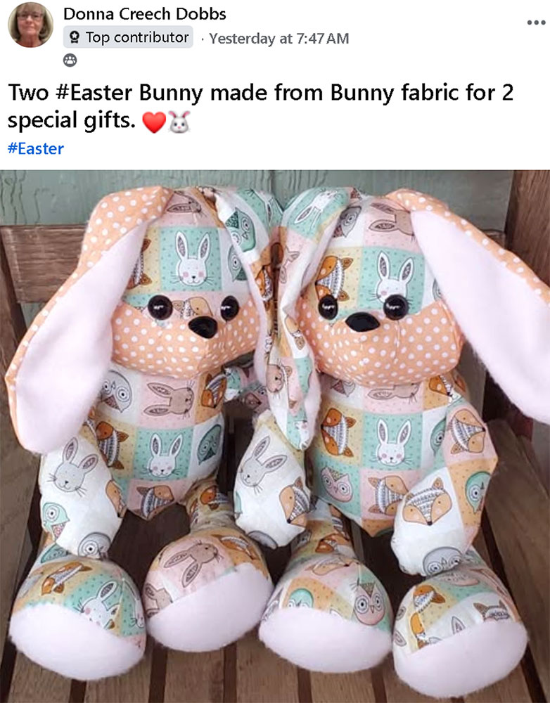 Joy Snouffer sewed 2 cute Easter Bunny Buddies for her granddaughters.. I can’t pick a favourite!