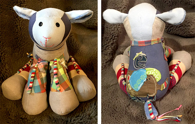 I’m loving this little Lamkins Lamb sewn by Joanne Williams. She sewed this sweet baby keepsake toy out of baby clothes! She incorporated buttons, ribbons, and other aspects of the clothing into the toy.
