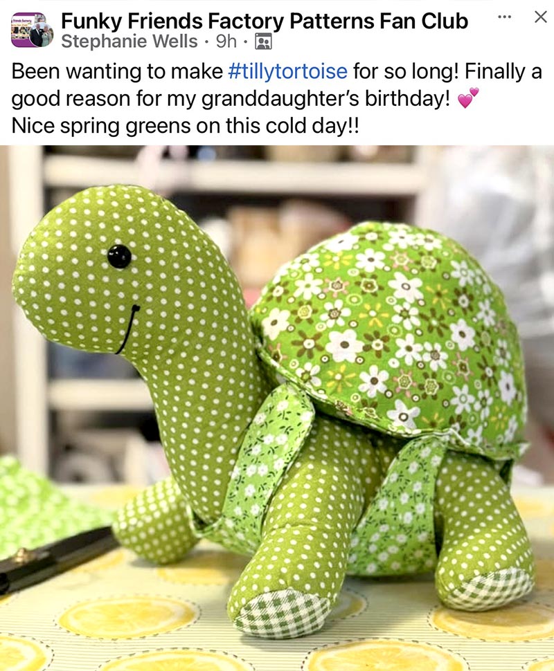 And this sweet Spring version of Tilly Tortoise toy pattern was sewn by Stephanie Wells.